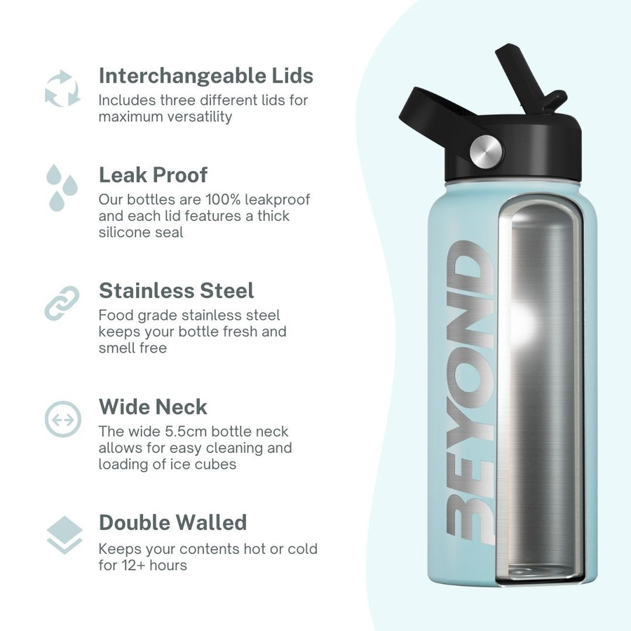 Like all Beyond Bottles, the Pastel Blue Stainless Steel Water Bottle comes in a stylish gift box, complete with three interchangeable lids, two straws, and a cleaning brush to keep germs and bacteria at bay. It’s non-toxic and 100% BPA-free, making it the perfect water bottle for children and adults.
